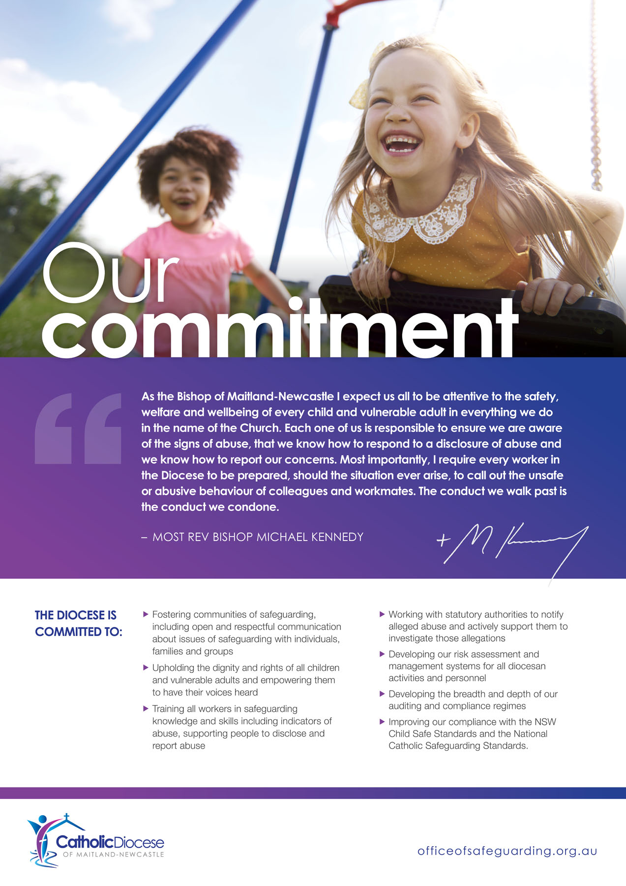 The Catholic Diocese of Maitland-Newcastle has an abiding commitment to promote the safety, welfare and well being of children and vulnerable persons — particularly those who participate in the life of the Diocese as part of our faith communities in parishes, in our diocesan systemic schools, early education centres and out-of-school hours care service, as part of our welfare and community services through CatholicCare and other diocesan ministries.